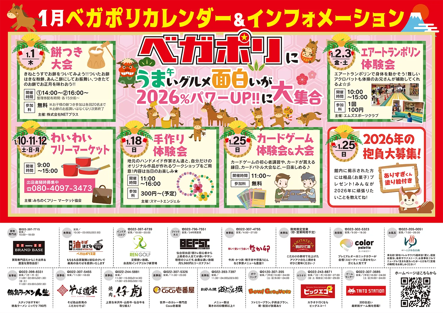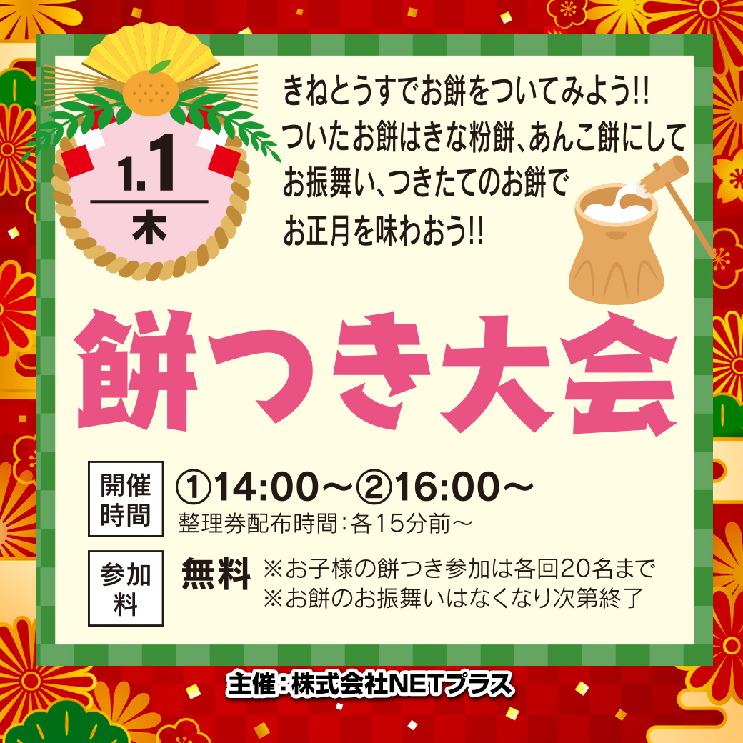 | 参加料金: | 参加無料 ※お子様の餅つき参加は各回20名まで ※お持ちの振る舞いは無くなり次第終了 |